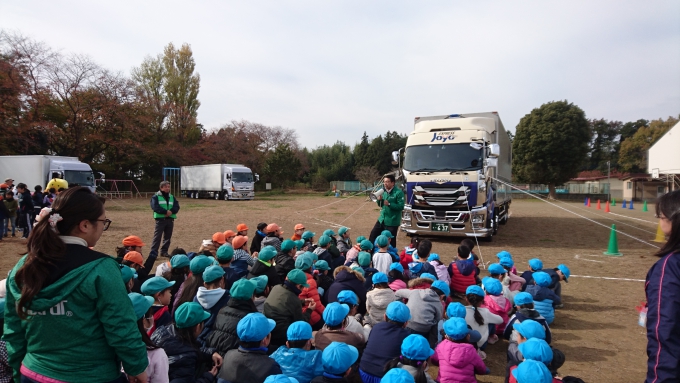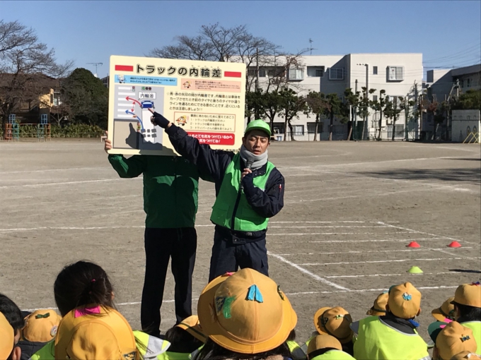 いずれも低学年の児童さんを対象に開催され、トラック特有の「死角」「内輪差」について、トラックを走行させた実演を交え、体験型の授業となりました。